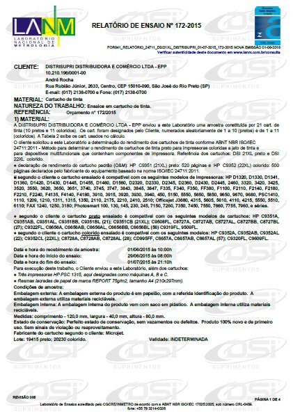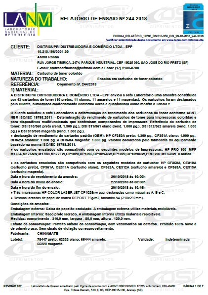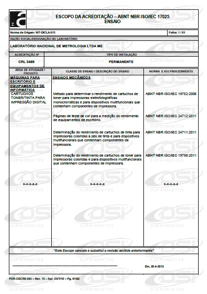 NORMAS ABNT NBR ISO/IEC: 19752 – Toner Monocromático/19798 – Toner Colorido/24711 – Cartucho de Tinta Preto/24712 – Cartucho de Tinta Colorido.